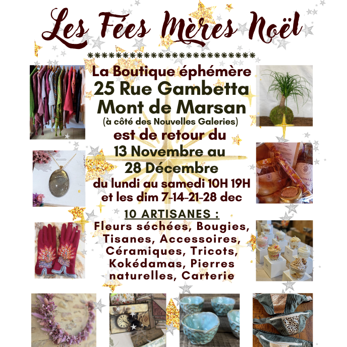 Du 13 Novembre a 28 Decembre de 10h à 19h, venez me retrouver avec 9 autres créatrices à Mont de Marsan au 25 de la Rue GAMBETTA à côté des Nouvelles Galeries.