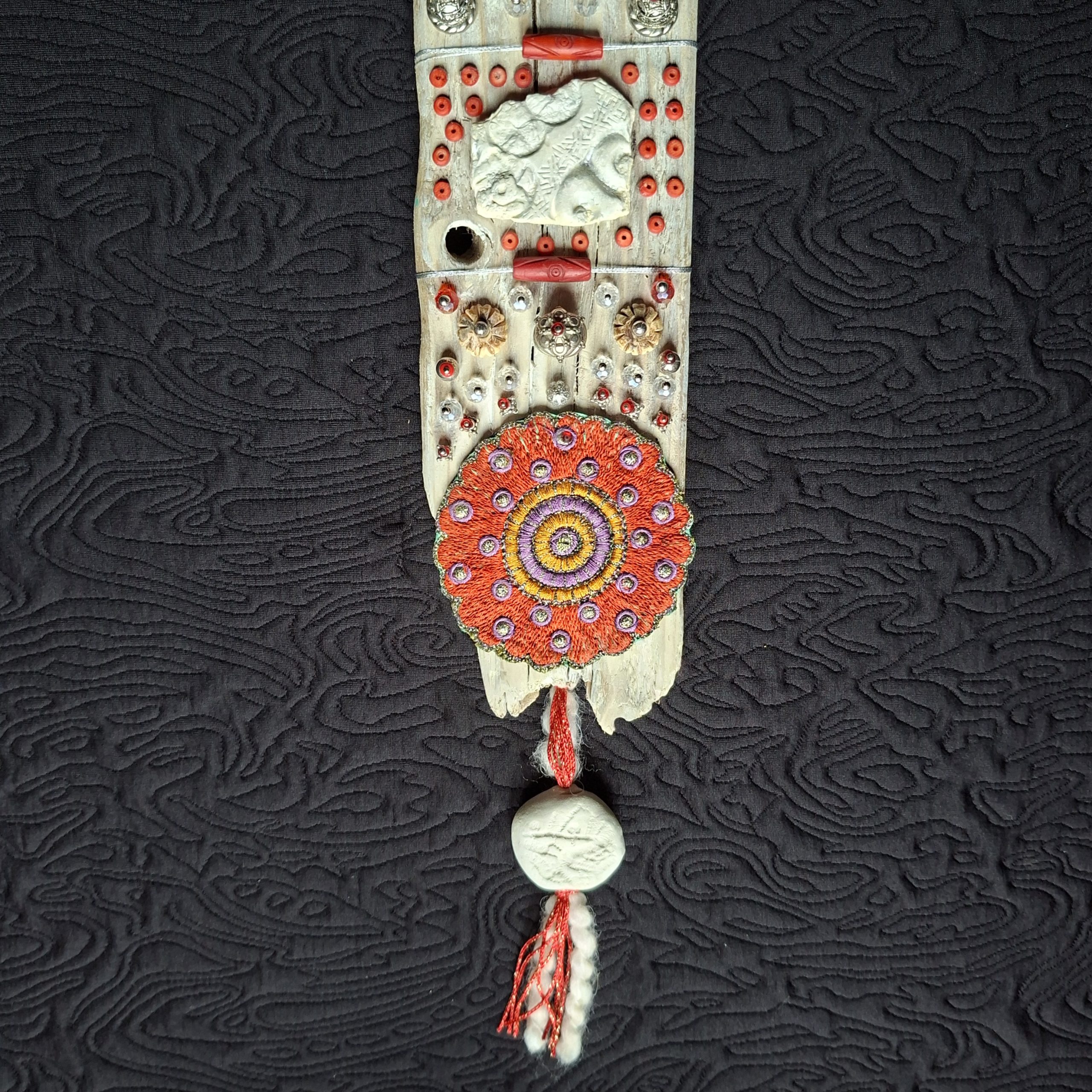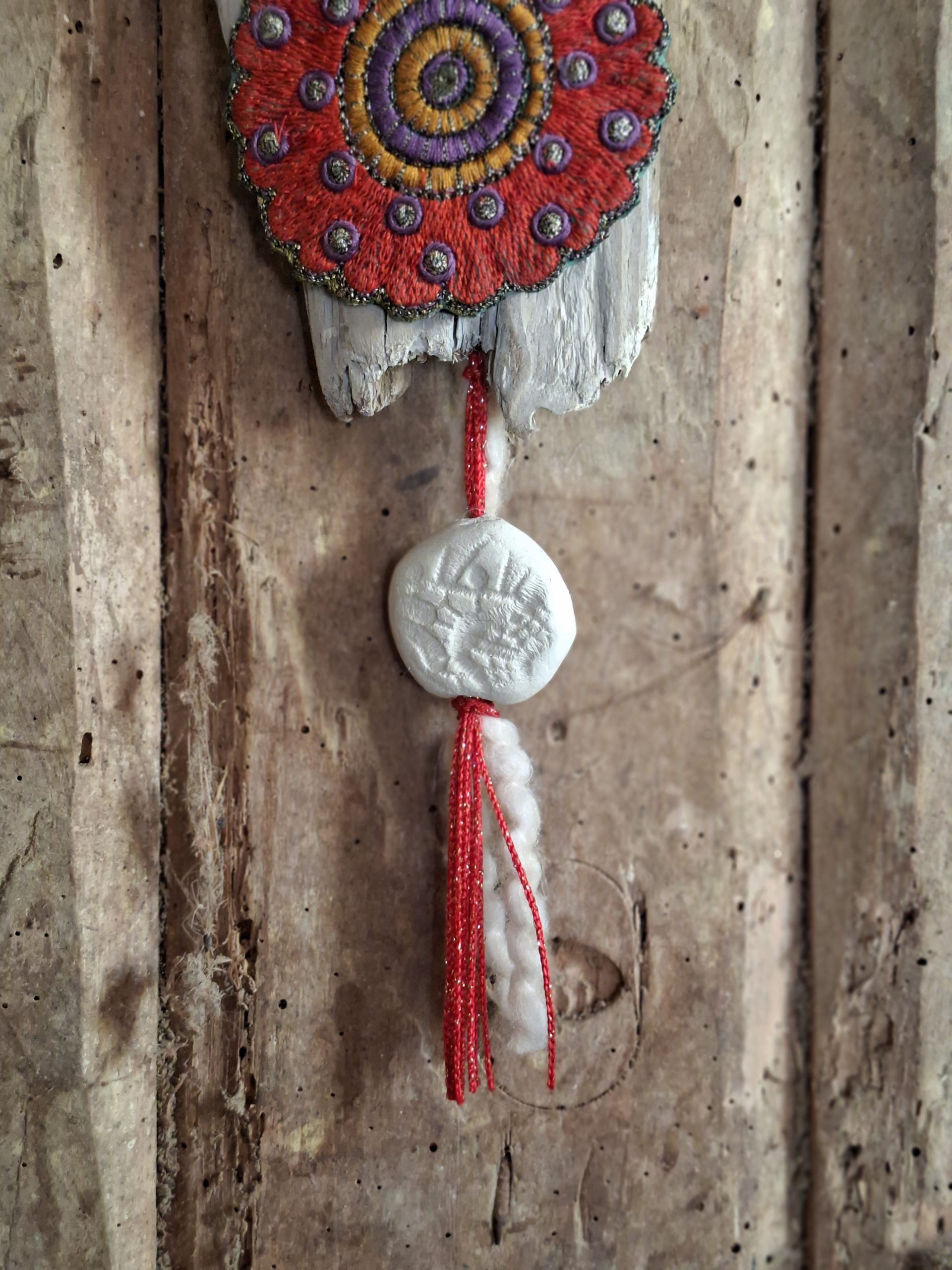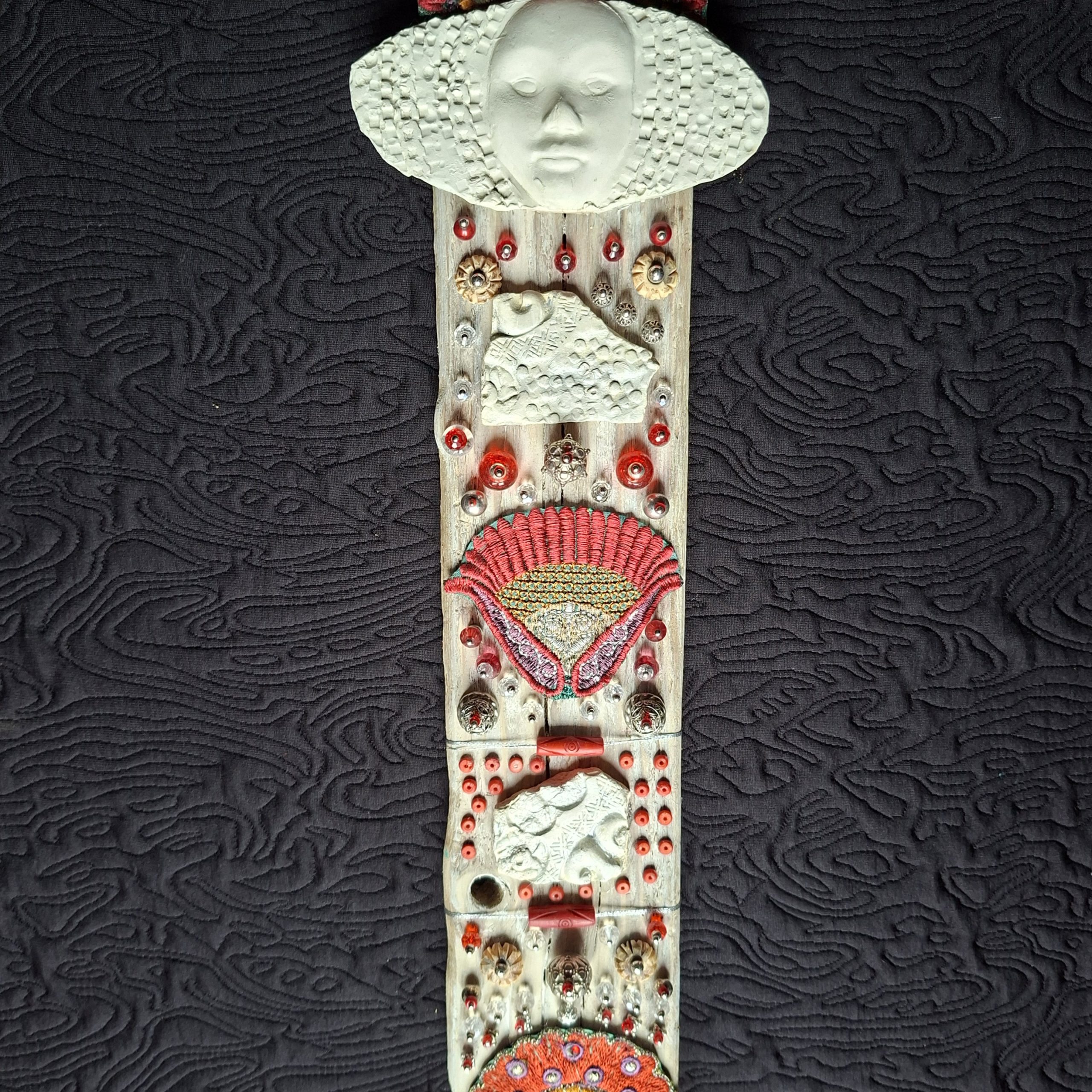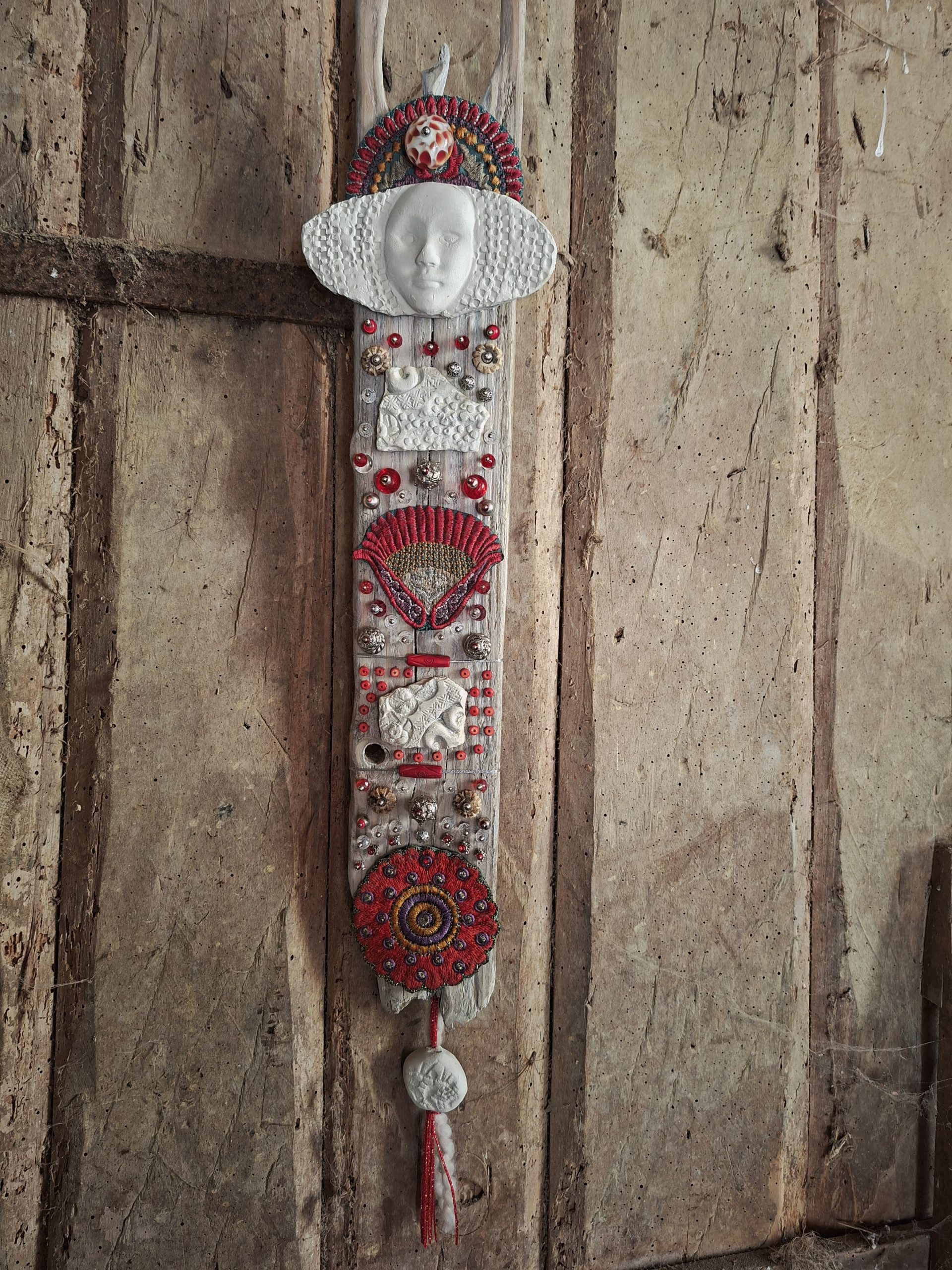 Nous avons des oies dans notre lieu de vie et elle aime grignoter les bouts de bois qu’elles sont sur leur parcours et lorsque je me promène dans leur espace je trouve ces parties de planches qui sont devenues comme des bois flottés sauf qu’ils n’ont pas vu d’eau courante, mais les petites dents des oies 🙂 Je trouve ces bois très inspirants et je les prends comme un support d’expression complètement libre. il se trouve que des visages me sont venus réalisés en argile auto durcissante et ensuite je fouille dans tous les tiroirs pour satisfaire mon seil et trouve léquilibre qui me plait dans la composition globale. Celui ci mesure 66 cm de haut et 9 cm de large. Il y a un système d’accroche au dos.