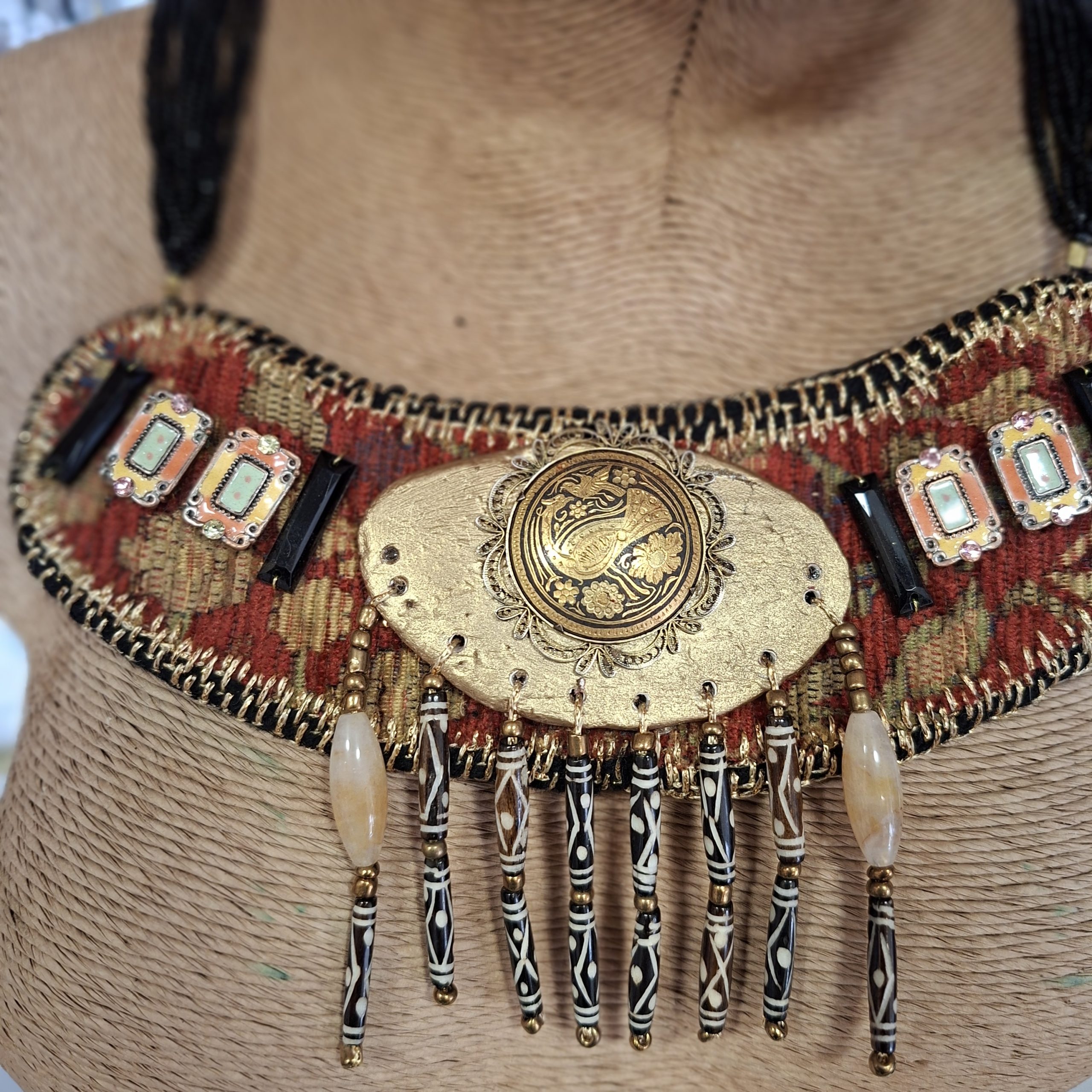 C’est mon tout premier collier réalisé à partir de recyclage de bijoux, de tissus et autres « bidouillages » personnels 🙂 j’ai ensuite brodés les éléments pour en faire une parure !