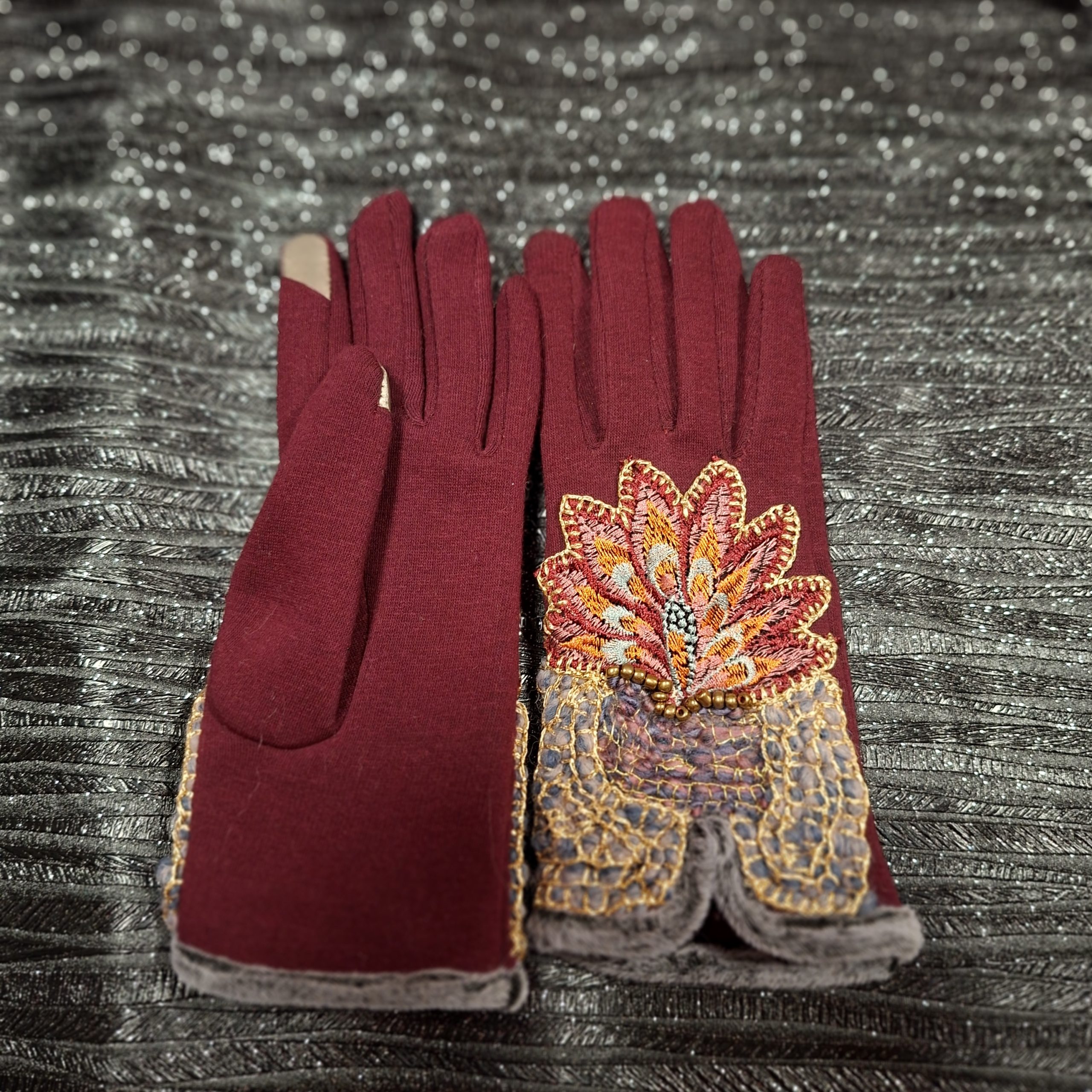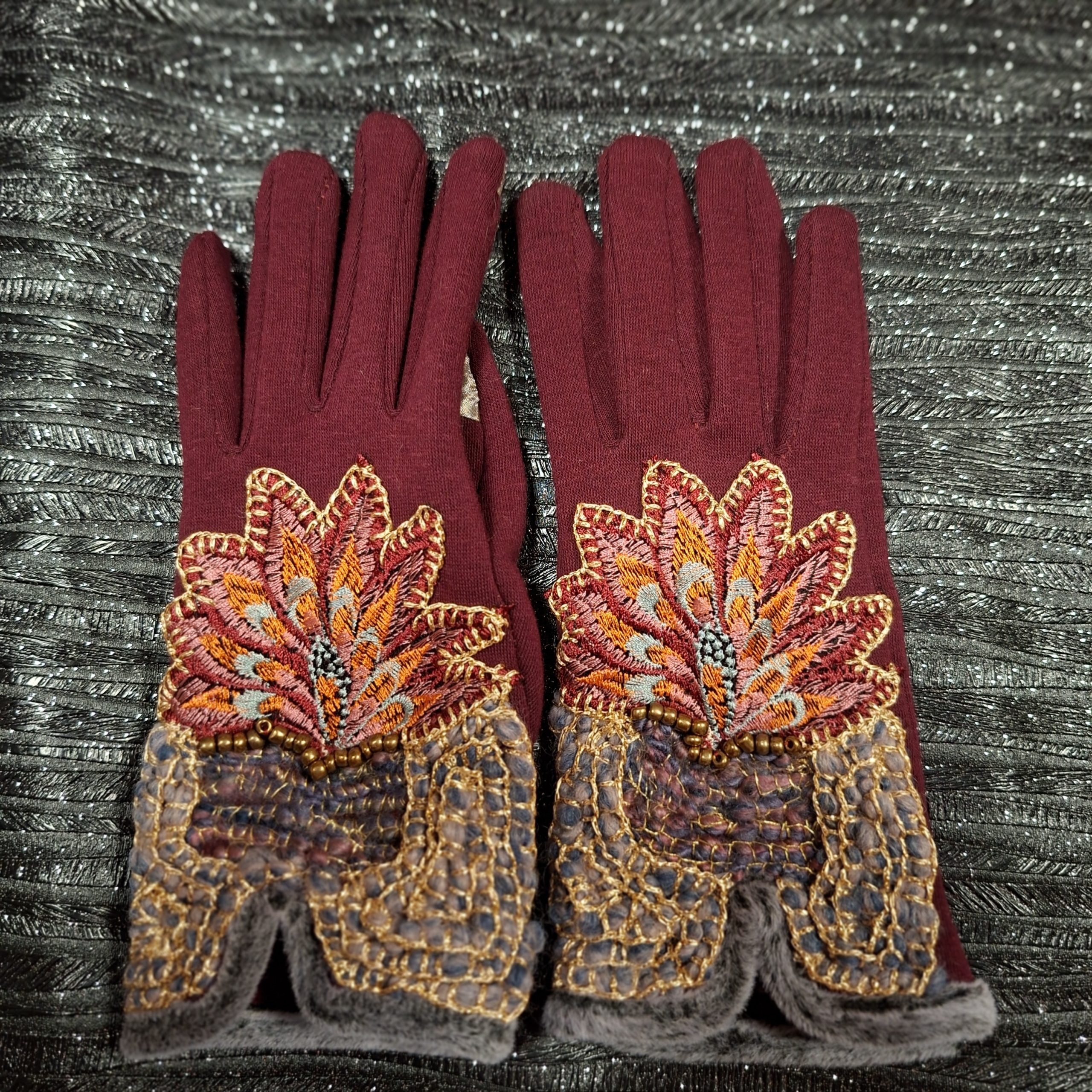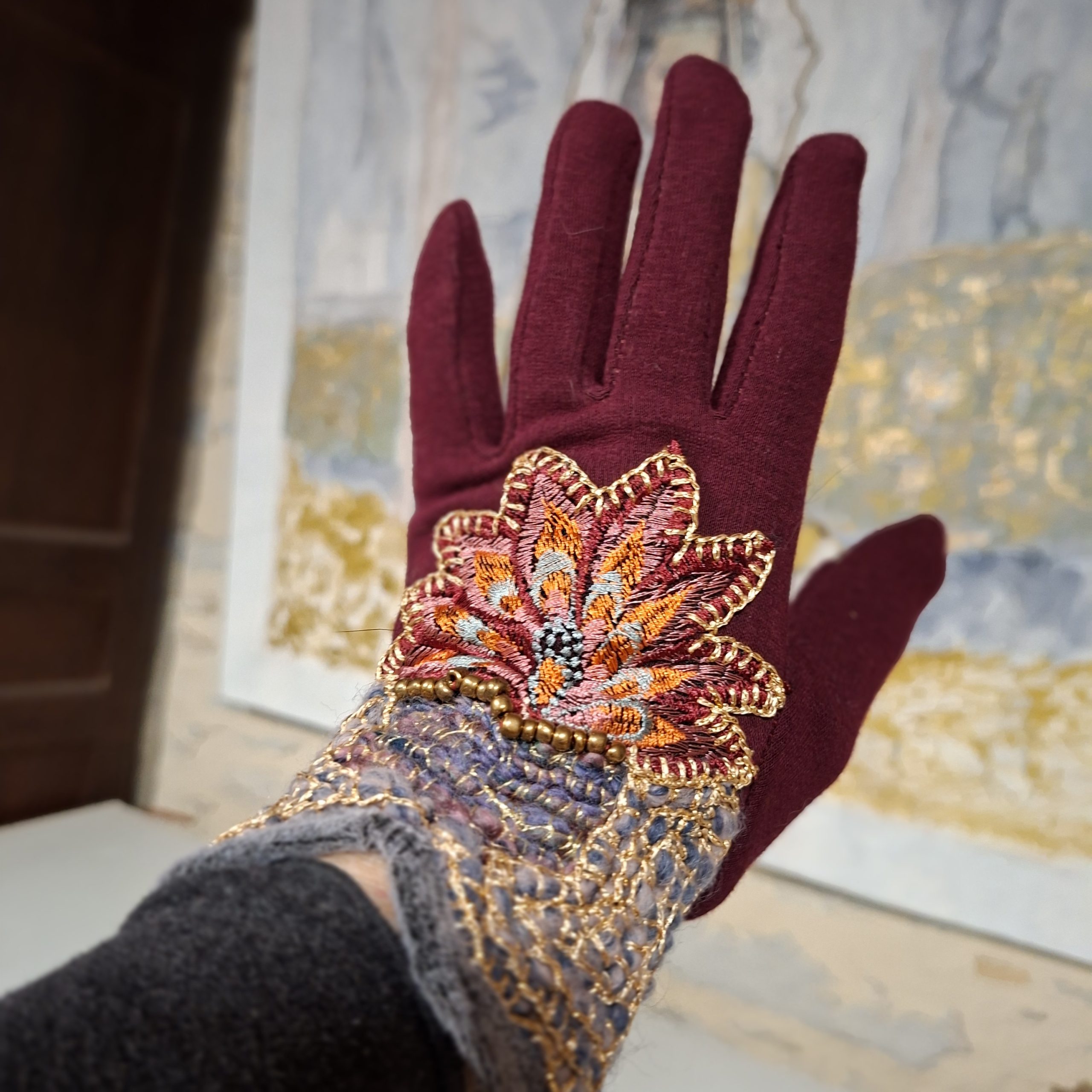 Gants brodés avec des chutes de sari, des laines fantaisies ainsi que des fils dorés. Ces gants sont très chauds et très doux. Ils sont un peu elastane ce qui permet de convenir à toutes les mains.