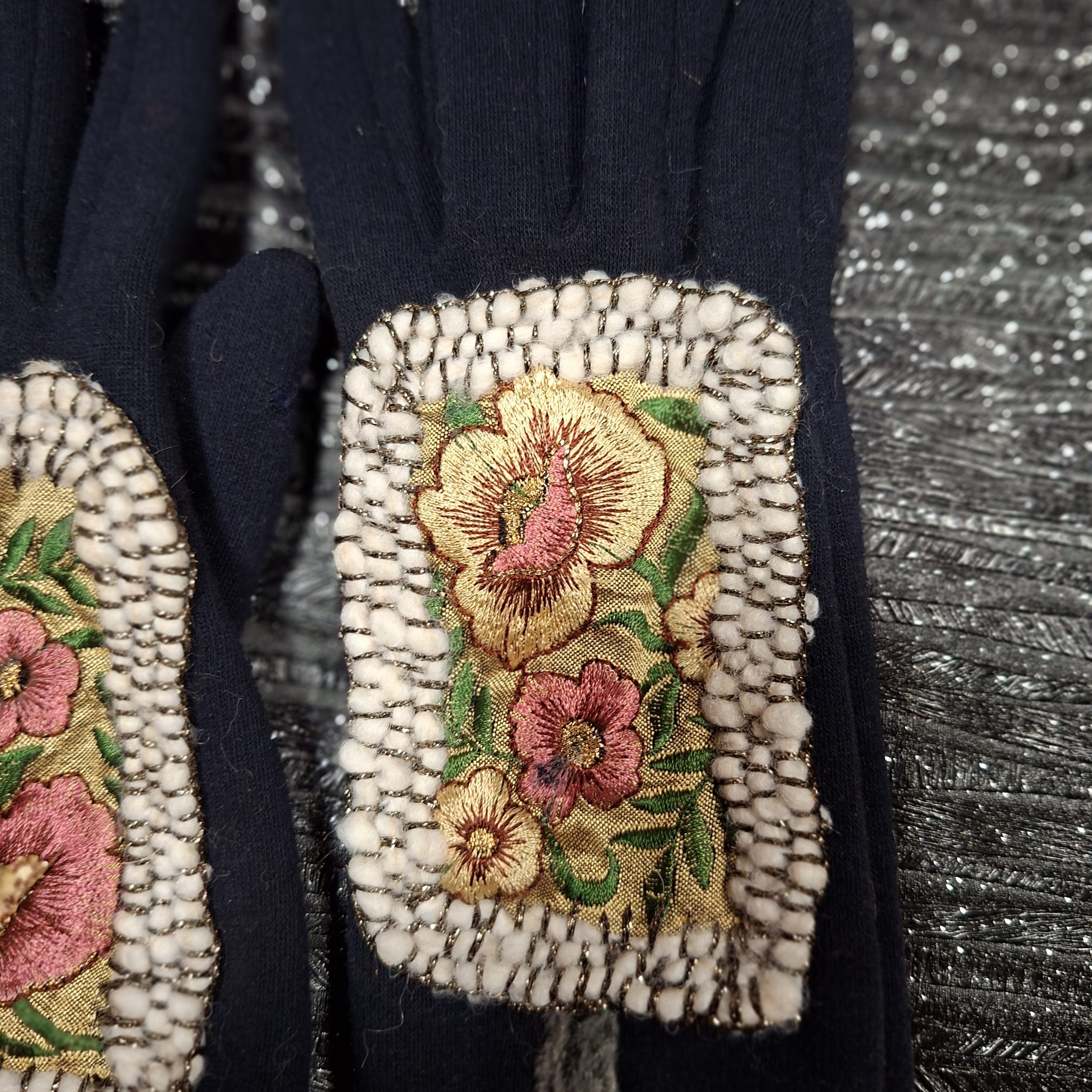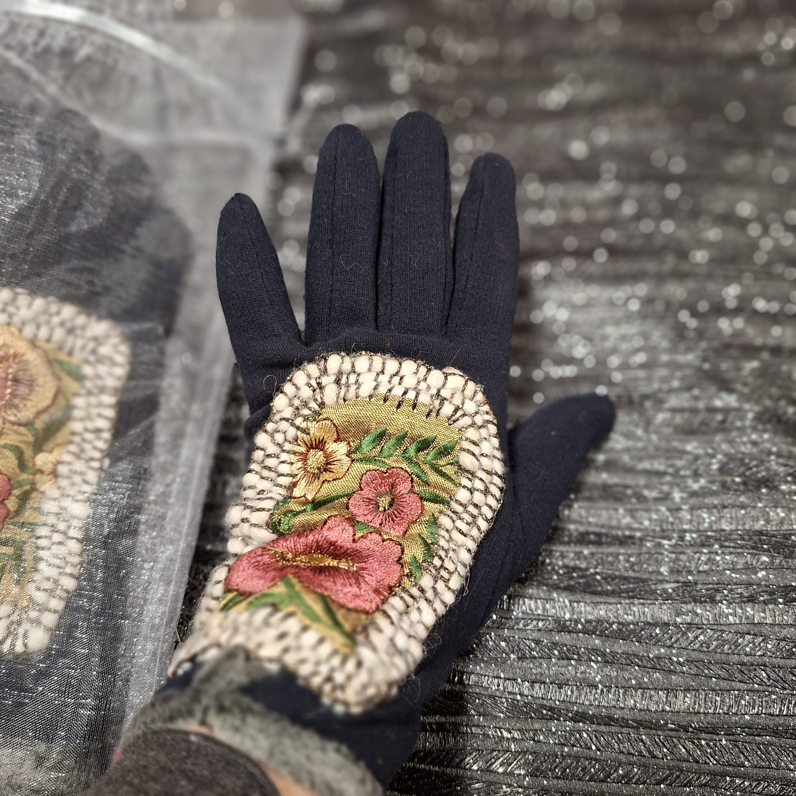 Gants brodés avec des chutes de sari, des laines fantaisies ainsi que des fils dorés. Ces gants sont très chauds et très doux. Ils sont un peu elastane ce qui permet de convenir à toutes les mains.