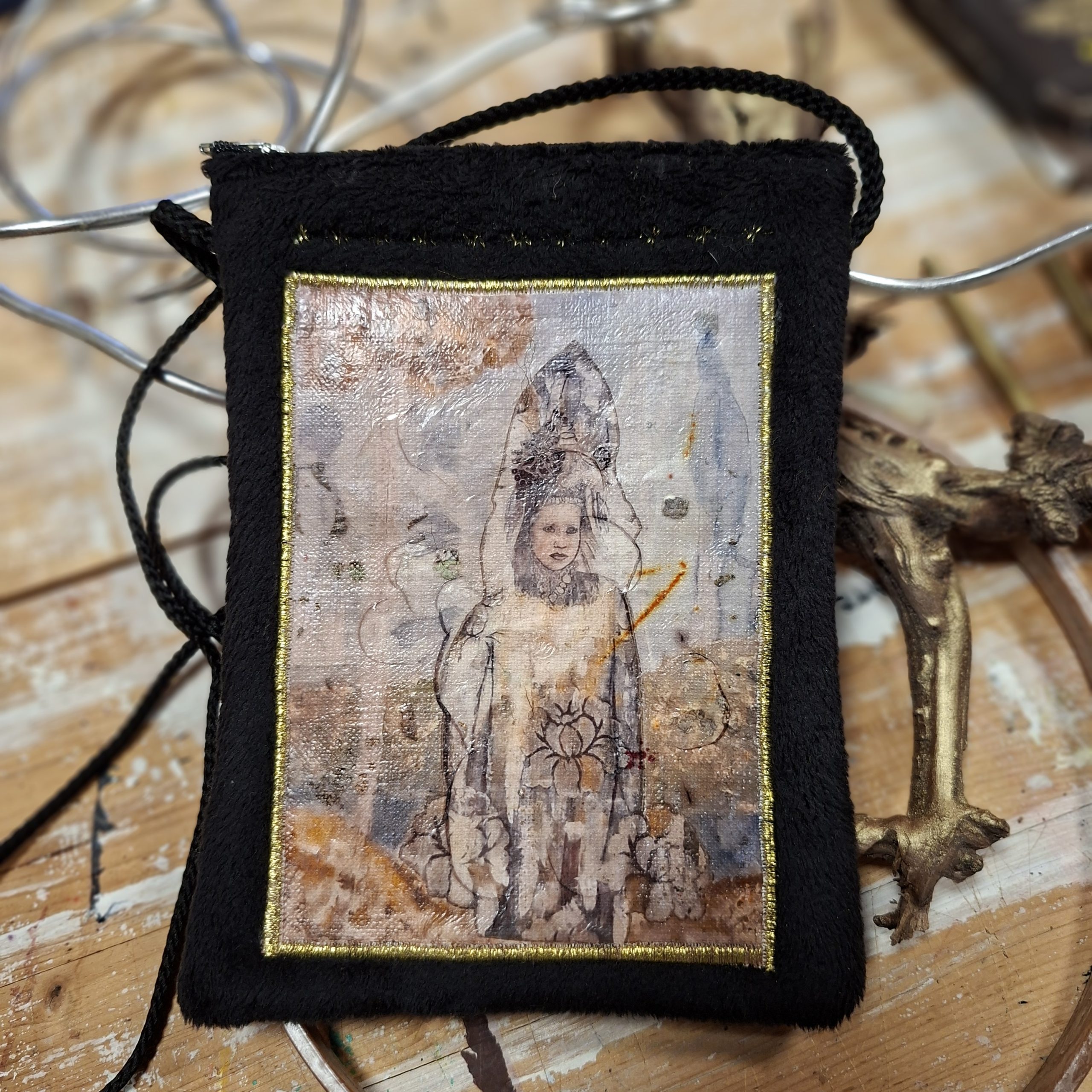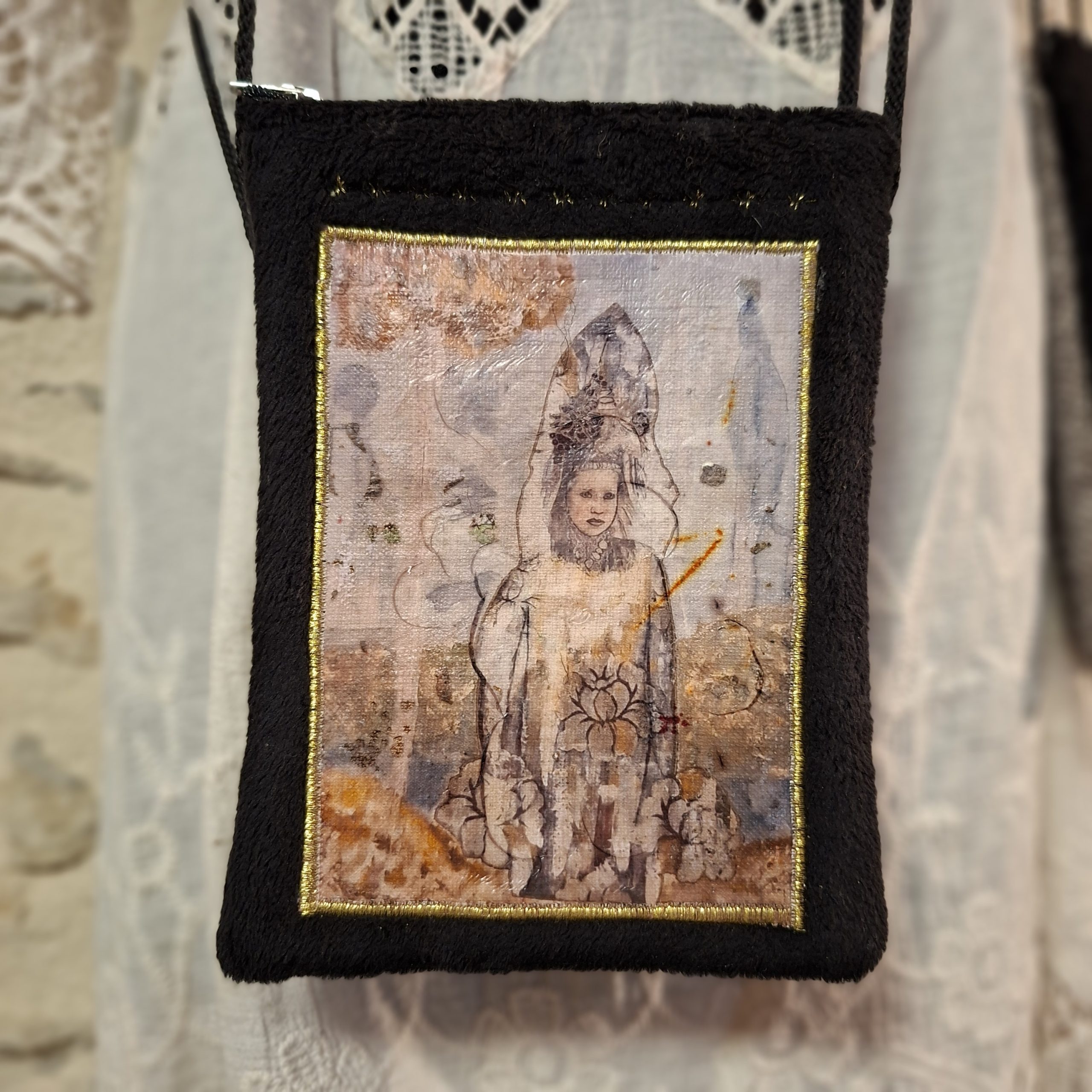 Pochette petit format pour se balader avec juste ce qu’il faut. Une pochette pièce unique réalisée avec des tissus recyclés et agrémentée d’une « illustration mixed media » unique créée avec à partir de peintures, photographies, transferts. Cette illustration est vernie de telle façon que l’on peut passer une éponge dessus si besoin. Dimension : 18X14 cm, longueur de la anse : 120 cm. Cette illustration « Femme aux apparitions » est une copie d’un tableau grand format que j’ai réalisé 🙂 à vous de voir où elle vous emporte 🙂