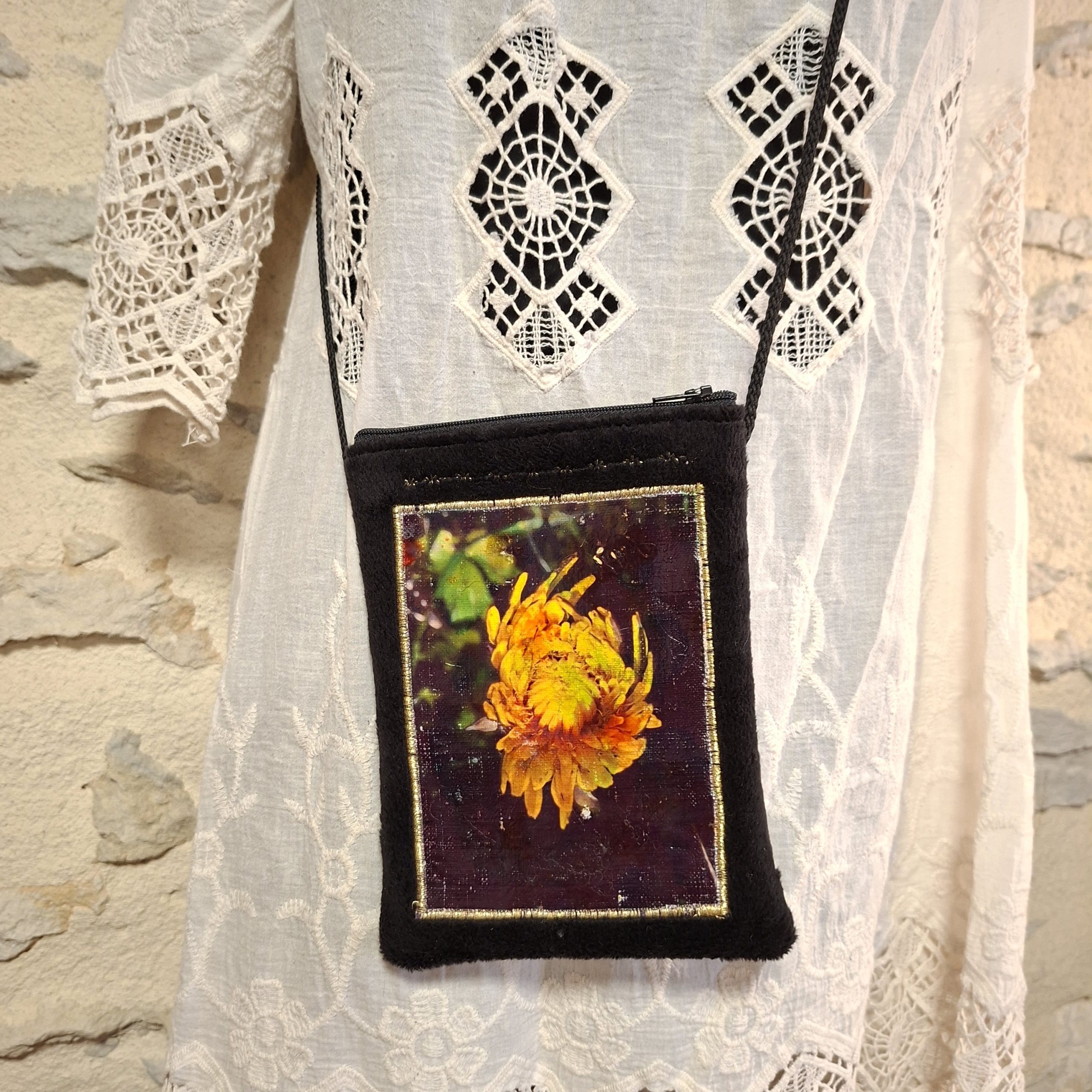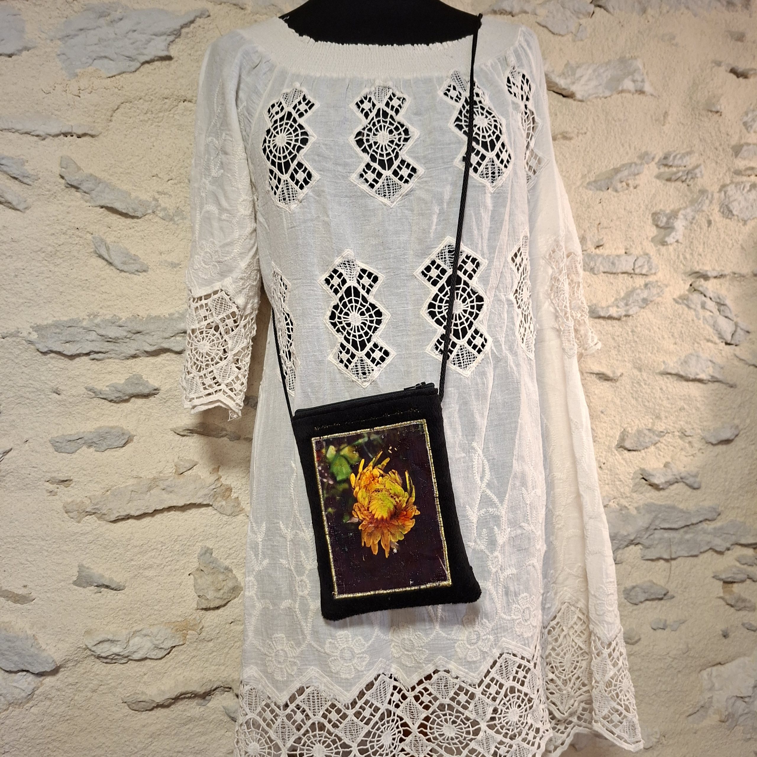Pochette petit format pour se balader avec juste ce qu’il faut. Une pochette pièce unique réalisée avec des tissus recyclés et agrémentée d’une « illustration mixed media » unique créée avec à partir de peintures, photographies, transferts. Cette illustration est vernie de telle façon que l’on peut passer une éponge dessus si besoin. Dimension : 18X14 cm, longueur de la anse : 120 cm. Cette illustration » Mon soleil » vient d’une photo que j’ai prise des premières fleurs du printemps 🙂 à vous de voir où elle vous emporte 🙂