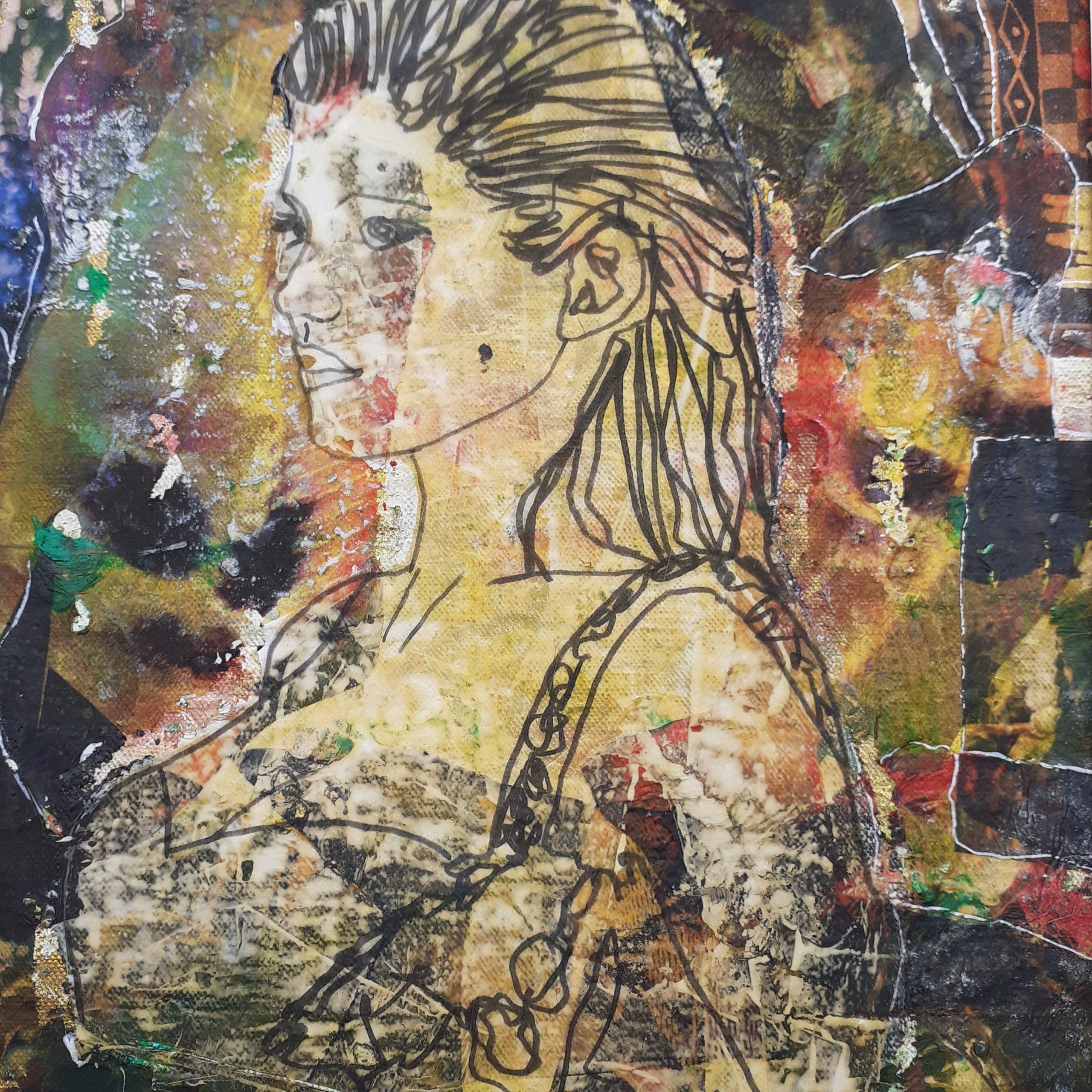 Ce portrait vient d’une impression parfois d’être un patchwork de lianes qui me lient aux autres mais aussi à la nature, et cet ensemble devient corps, ce qui me laisse toujours dans un espace de perplexité, c’est quoi d’être soi… Pour ce tableau j’ai utilisé des techniques mixtes aquarelle, encres, craies, posca, transfert. Et vous qu’est-ce qu’elle vous dit ? Format du tableau 29X20CM avec un encadrement noir de 33X43CM et 3,5 cm d’épaisseur ainsi qu’un passe partout noir.