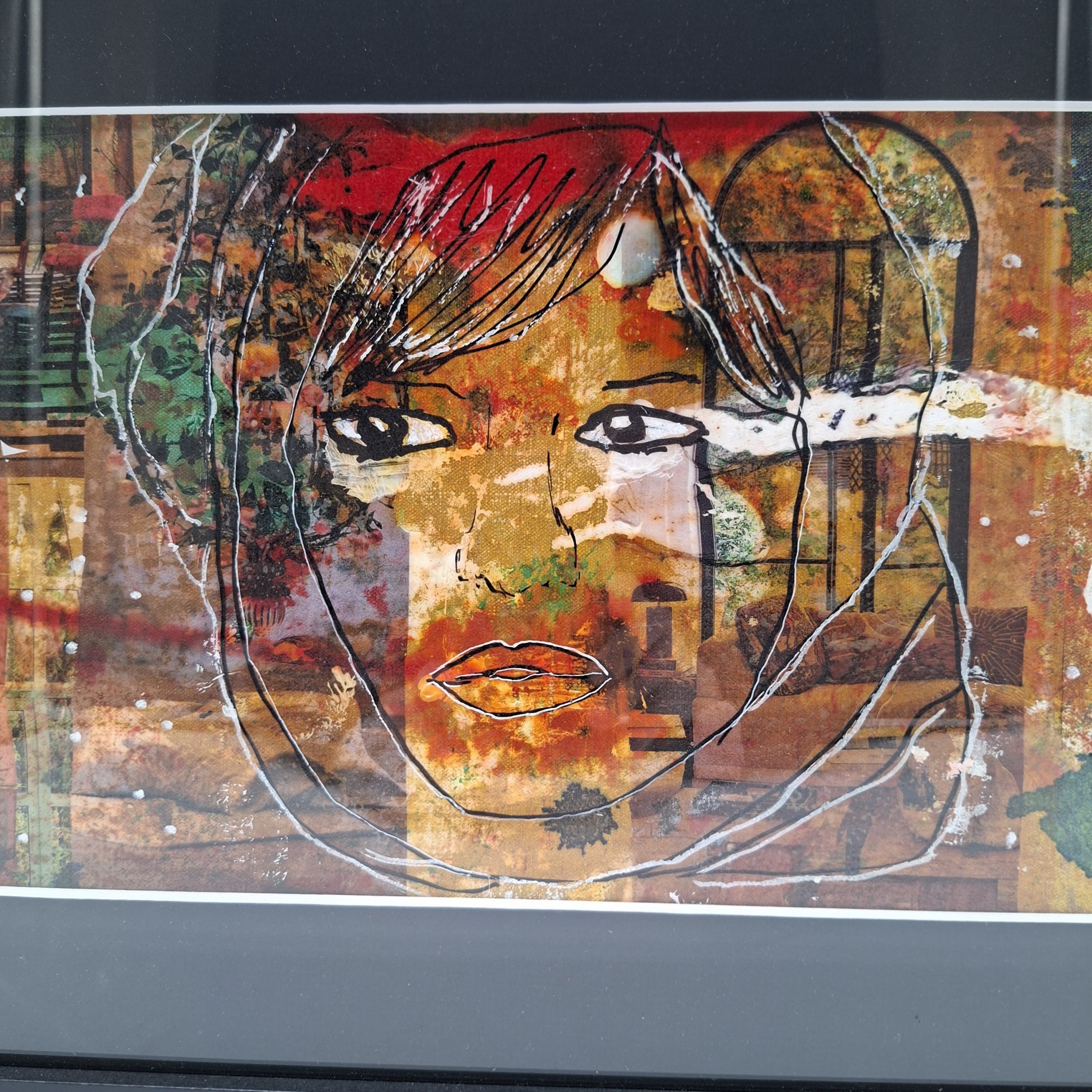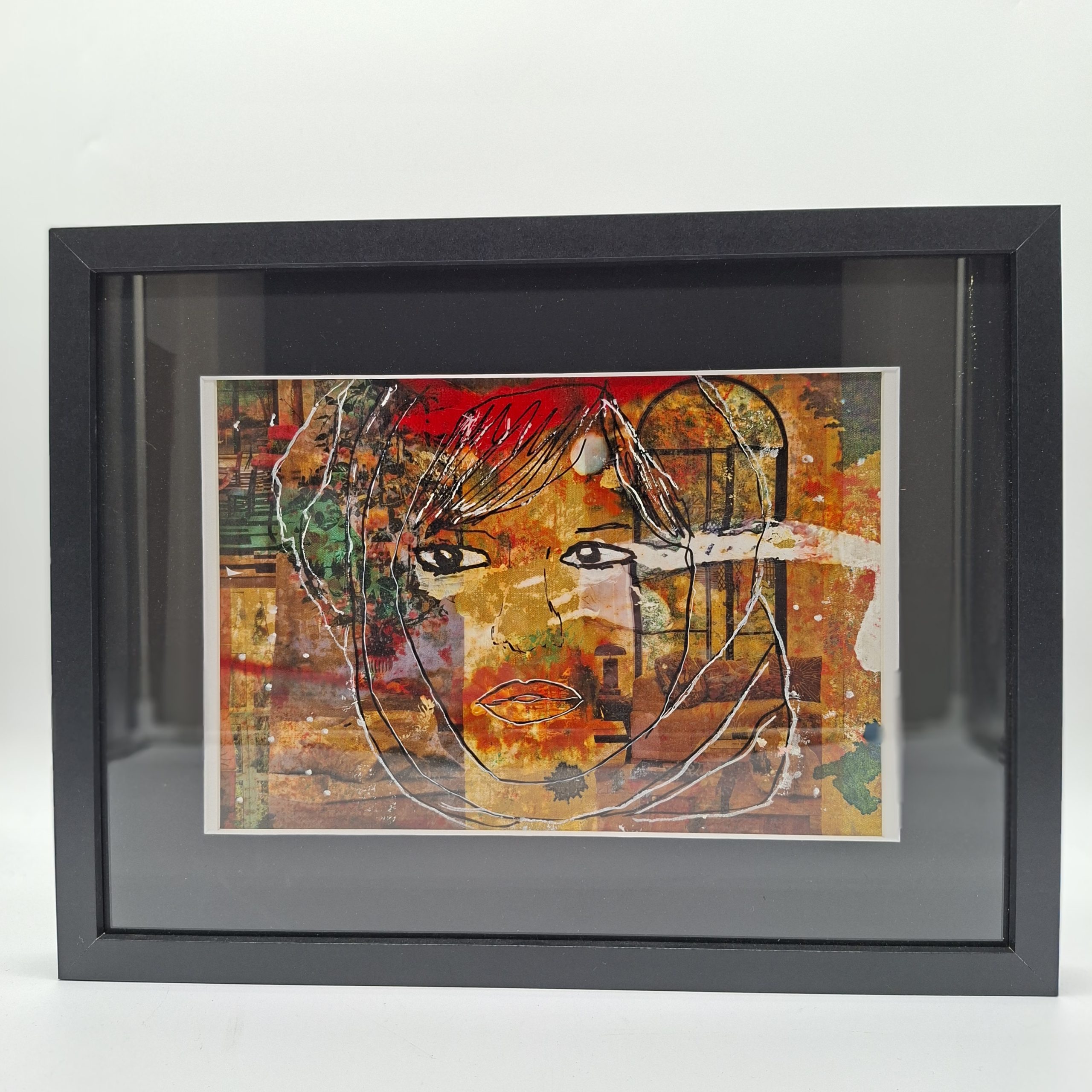 Encore un de ces visages avec une belle présence, c’est ce qui me plait 🙂 Après on l’interprète comme on veut, c’est ça le charme de l’art. Pour ce tableau j’ai utilisé des techniques mixtes aquarelle, encres, craies, posca, transfert. Et vous qu’est-ce qu’elle vous dit ? Format du tableau 29X20CM avec un encadrement noir de 33X43CM et 3,5 cm d’épaisseur ainsi qu’un passe partout blanc.