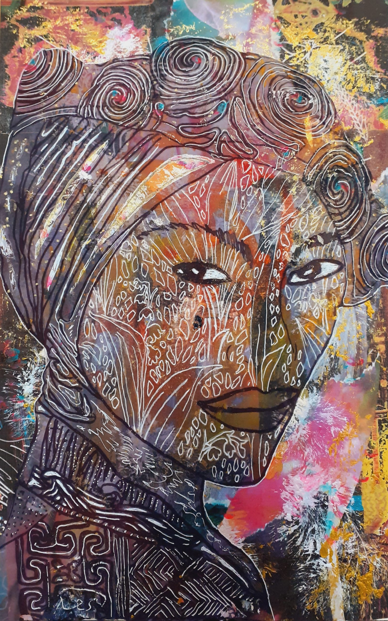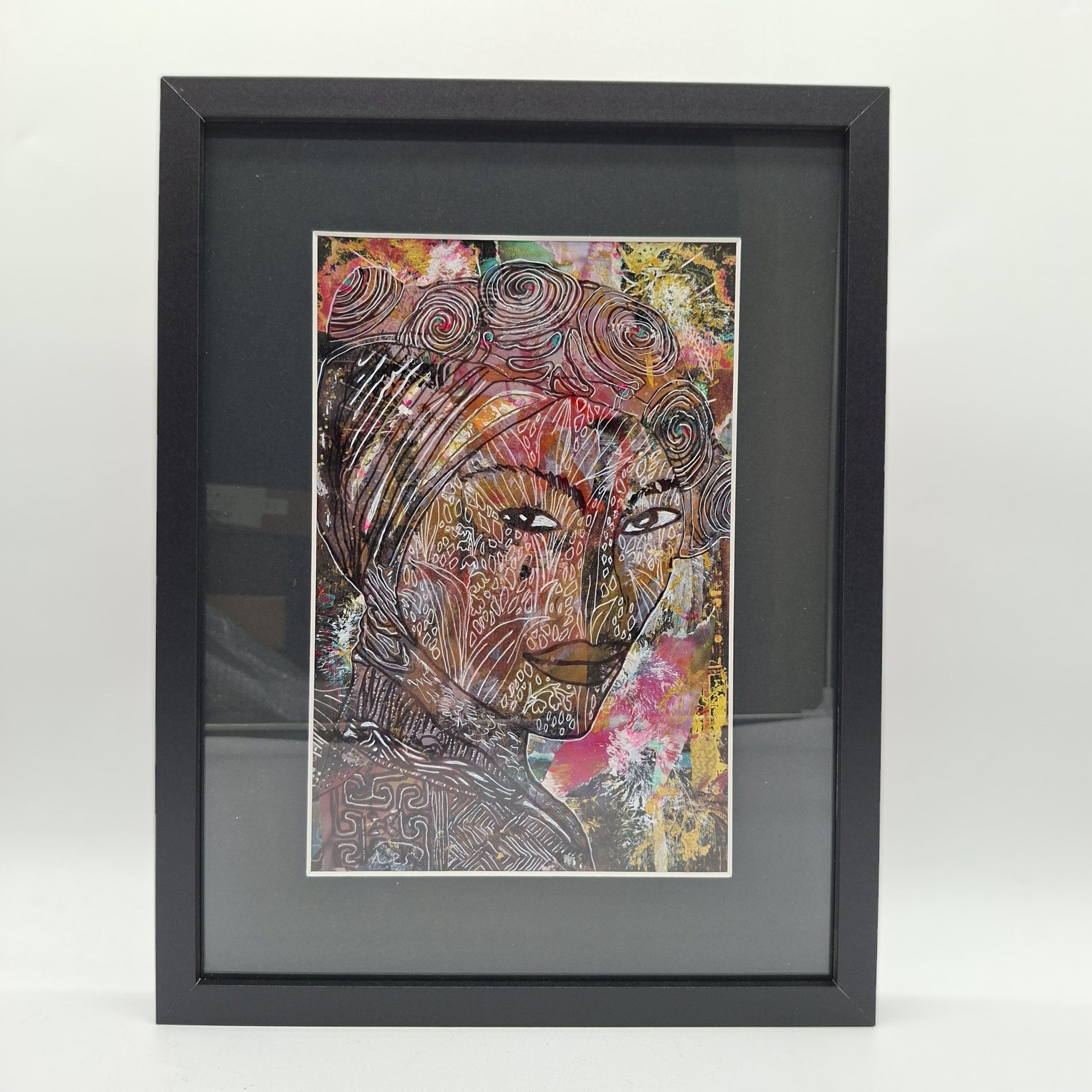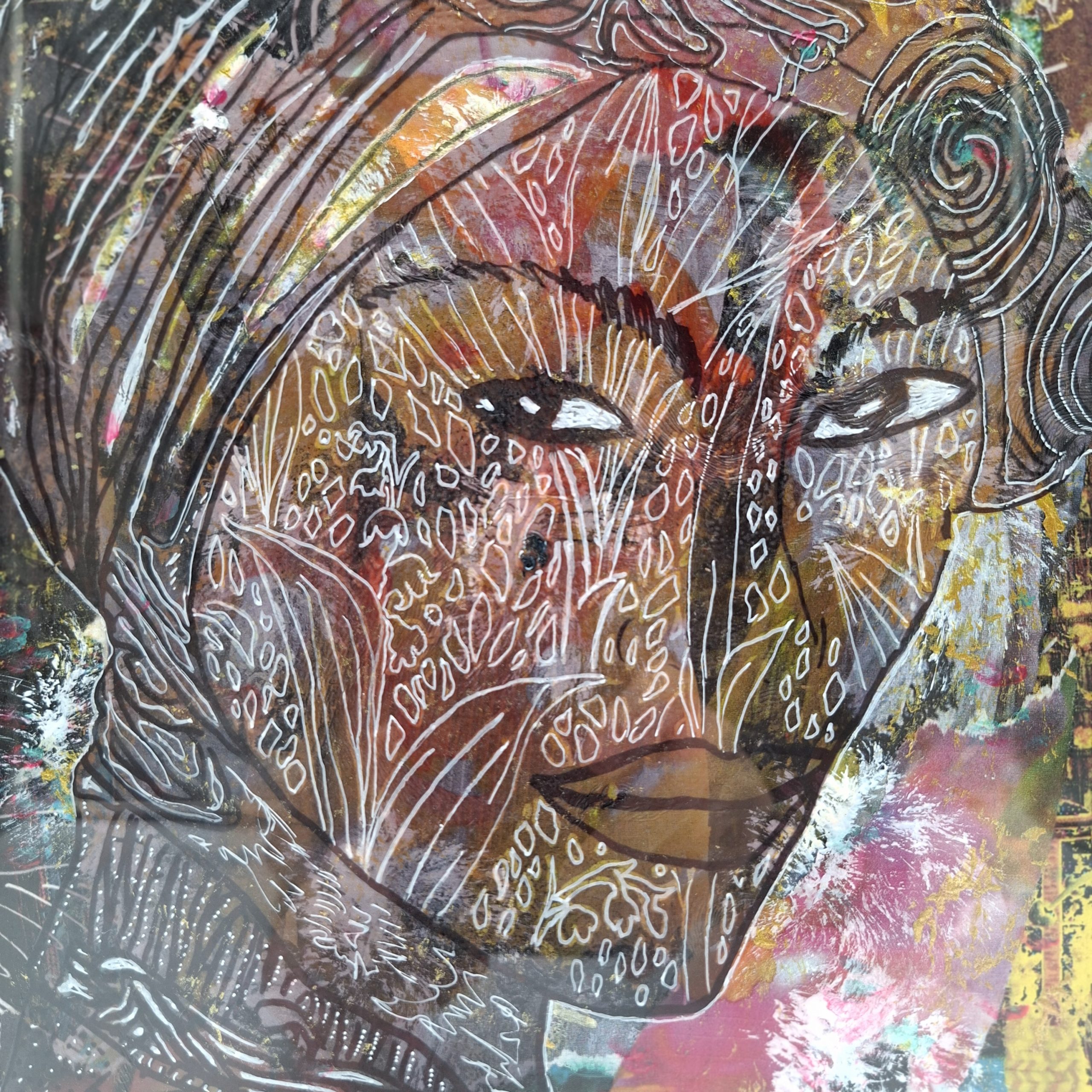 Encore un de ces visages avec une belle présence, c’est ce qui me plait 🙂 Après on l’interprète comme on veut, c’est ça le charme de l’art. Pour ce tableau j’ai utilisé des techniques mixtes aquarelle, encres, craies, posca, transfert. Et vous qu’est-ce qu’elle vous dit ? Format du tableau 29X20CM avec un encadrement noir de 33X43CM et 3,5 cm d’épaisseur ainsi qu’un passe partout blanc.
