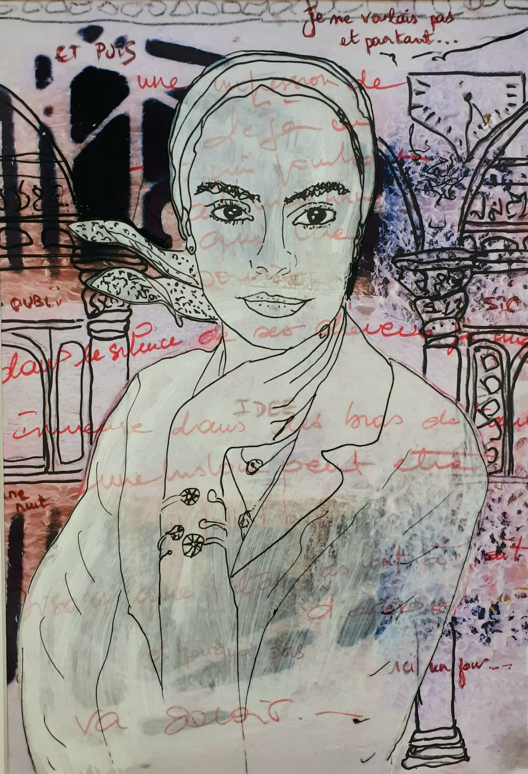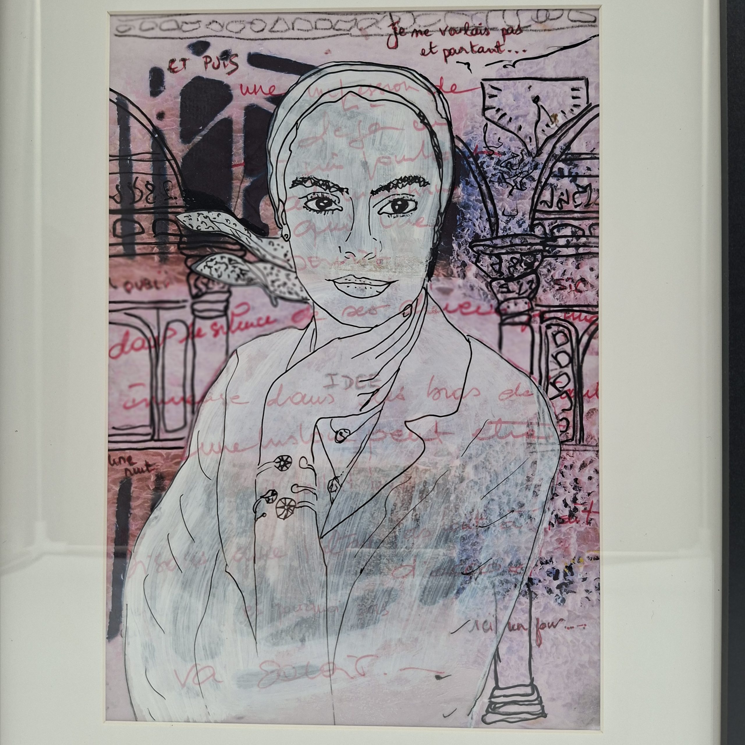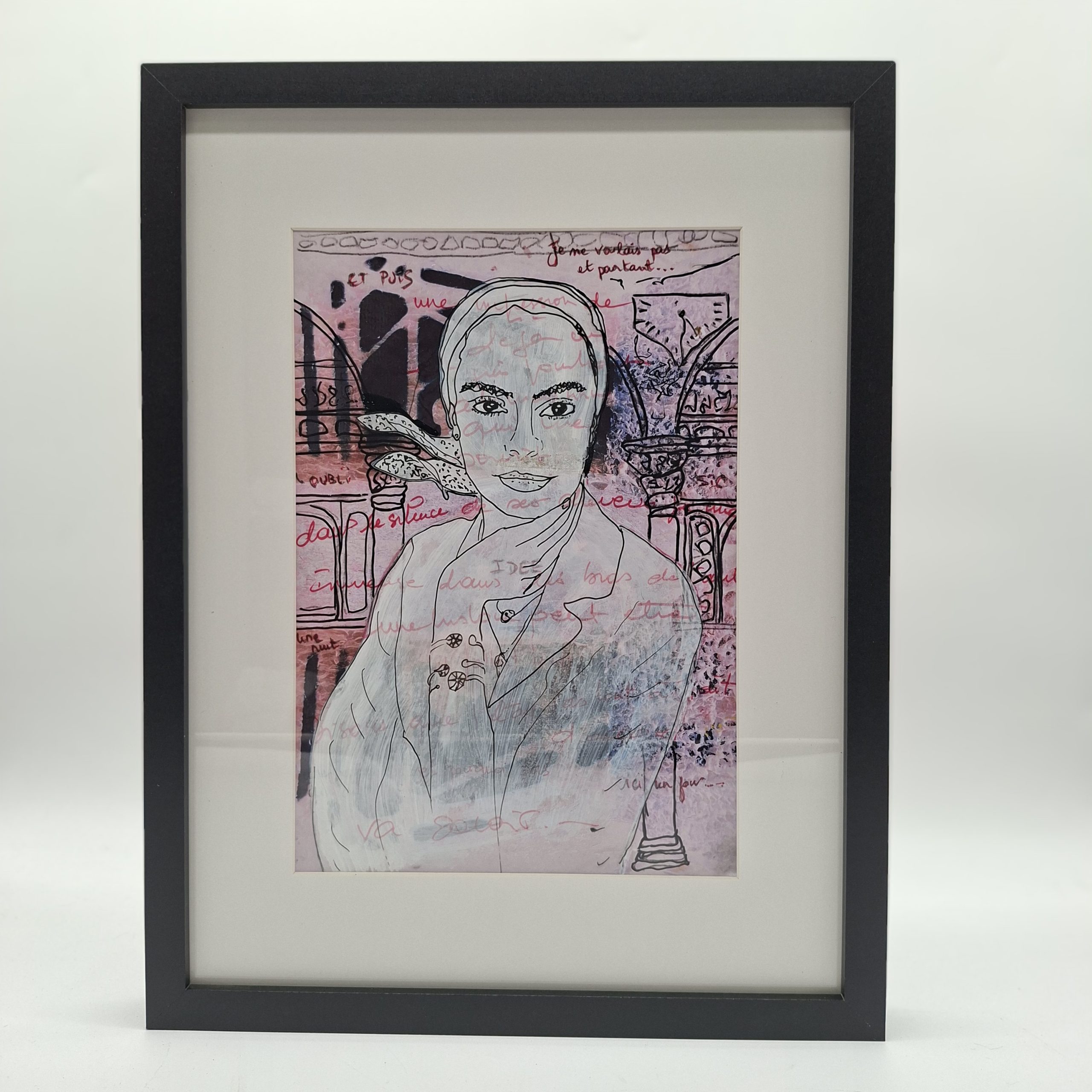 Encore un de ces visages avec une belle présence, c’est ce qui me plait 🙂 Après on l’interprète comme on veut, c’est ça le charme de l’art. Pour ce tableau j’ai utilisé des techniques mixtes aquarelle, encres, craies, posca, transfert. Et vous qu’est-ce qu’elle vous dit ? Format du tableau 29X20CM avec un encadrement noir de 33X43CM et 3,5 cm d’épaisseur ainsi qu’un passe partout blanc.